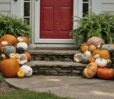 Perfect for standard porches and front entries! This stunning display features 20 pumpkins in beautiful variety, custom-designed by our award-winning autistic artist. Professional delivery and staging included – no heavy lifting required. Ideal for most homes wanting classic fall charm.